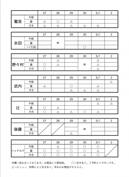 ☆4/27~5/2までのご予約状況☆