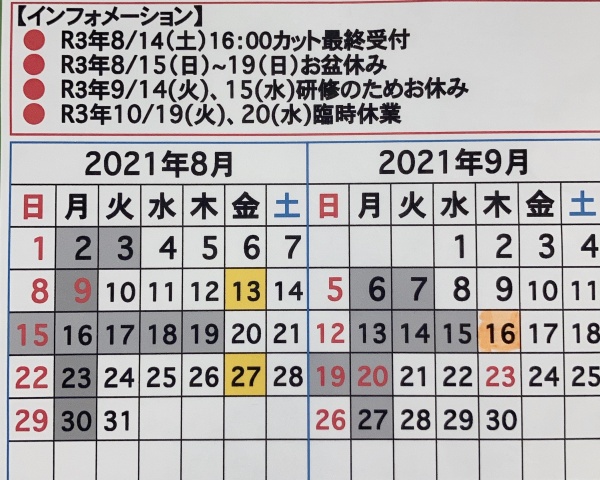 8月15日から19日までお休みとなります