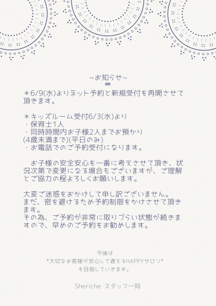 コロナの影響でご予約の制限をかけさせて頂いております。